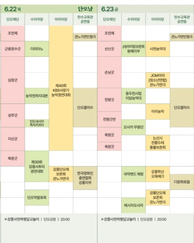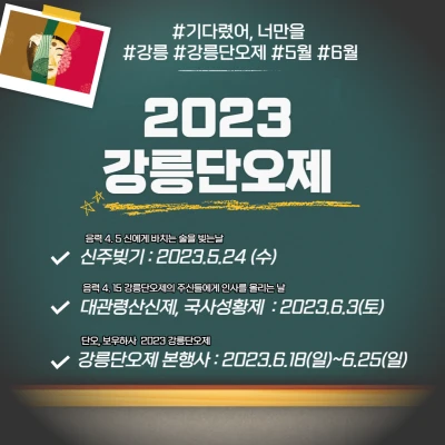 - 강릉단오제 본행사 : 2023.06.18 (일) ~ 06.25 (일)
