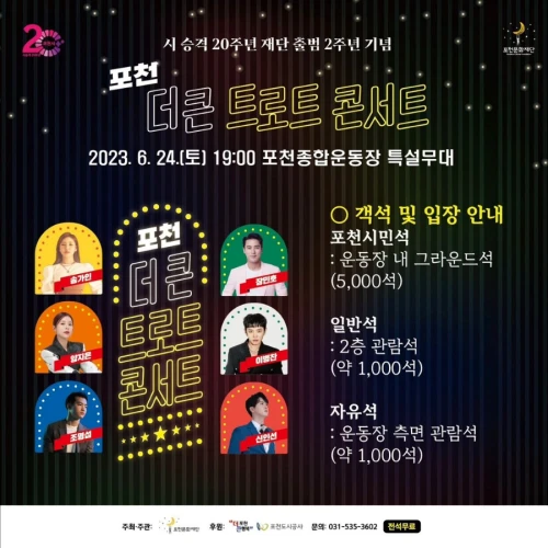 포천 지역이 시(市)로 승격된지 20주년이 도니 기념으로 포천 더 큰 트로트 콘서트를 실시한다고 합니다. 라인업도 화려하지만 입장권을 받기 위한 준비물도 필요하니 꼭 사전에 미리 준비하셔서 공연 관람 성공하시길 바랍니다.