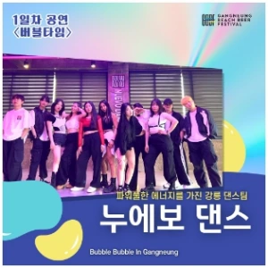 | 누에보 | '누에보(NUEVO)'라는 뜻처럼 늘 새로운 마음으로 최고의 무대를 보여주는 댄스팀으로, 이번 축제에서는 '우리들의 경포해변'이라는 테마로 시대별 음악에 맞춘 댄스를 ‘버블타임’에 만나볼 수 있습니다. 많은 관심과 호응부탁드려요 |